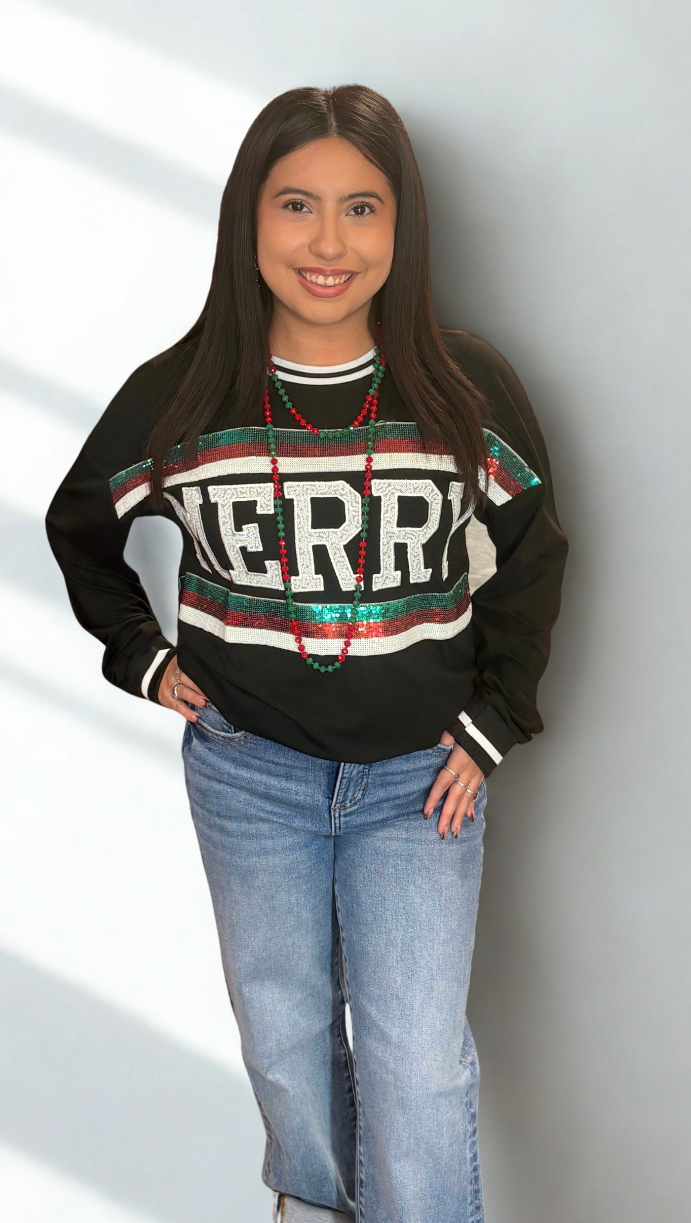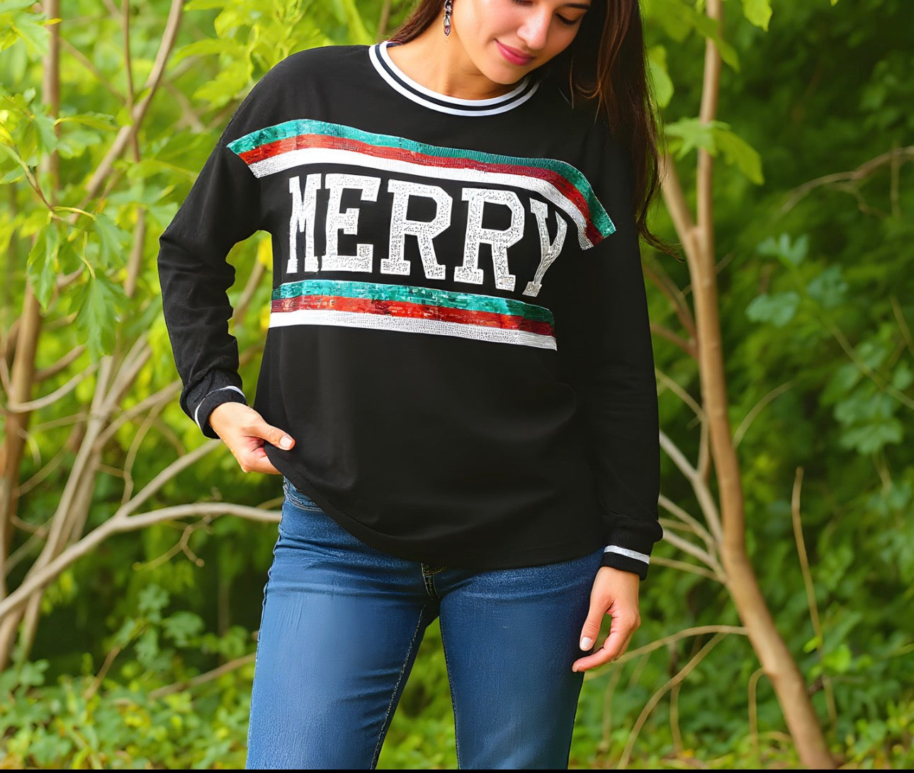 Perfect for holiday gatherings, evenings out, or any moment that calls for a little extra shine, this top pairs beautifully with sleek trousers, skirts, or your favorite denim. Dress it up or down — either way, you’ll sparkle in style.
