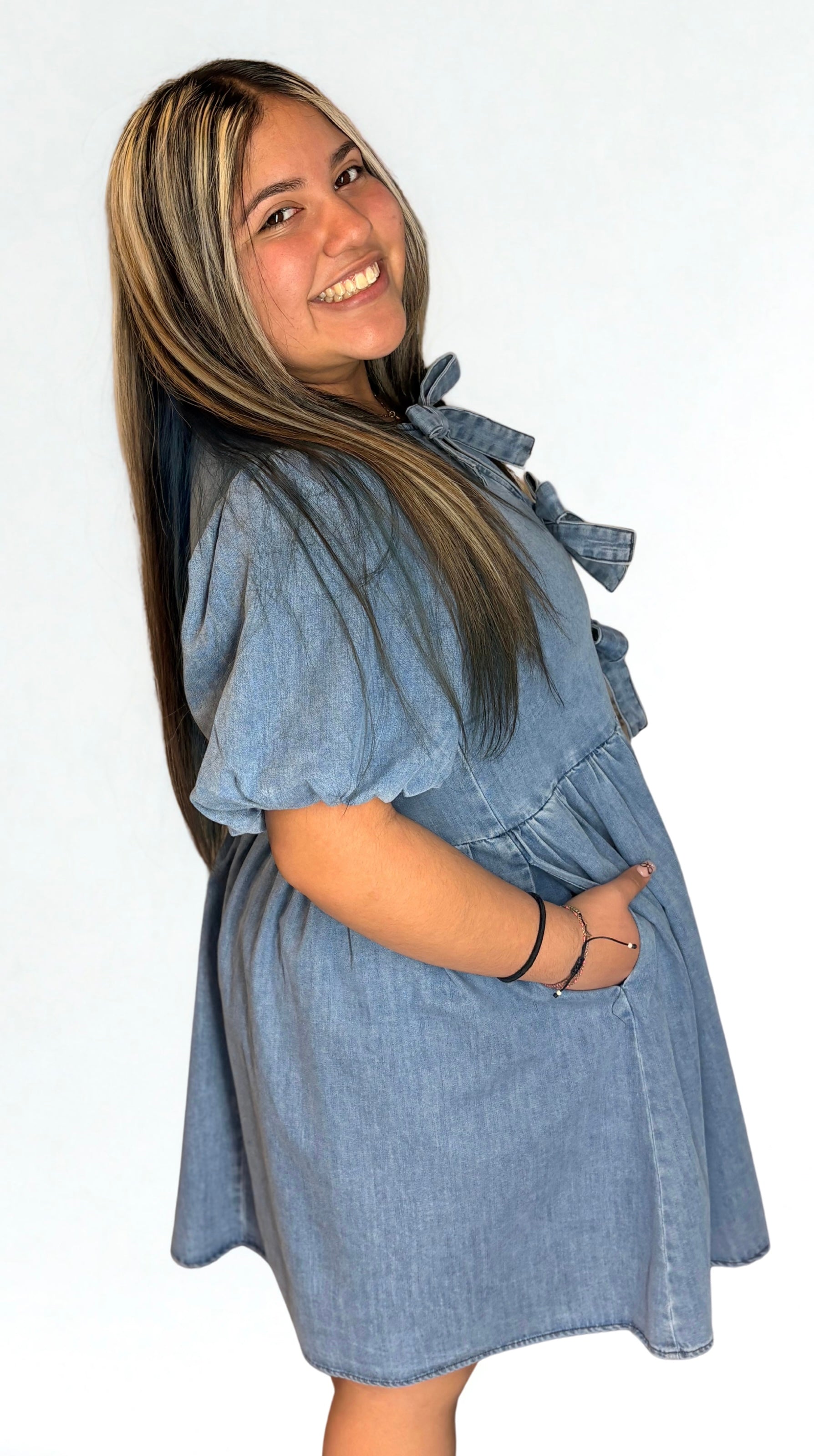 - Say hello to the sweetest denim moment of the season — our Bluebell Bow Denim Dress.