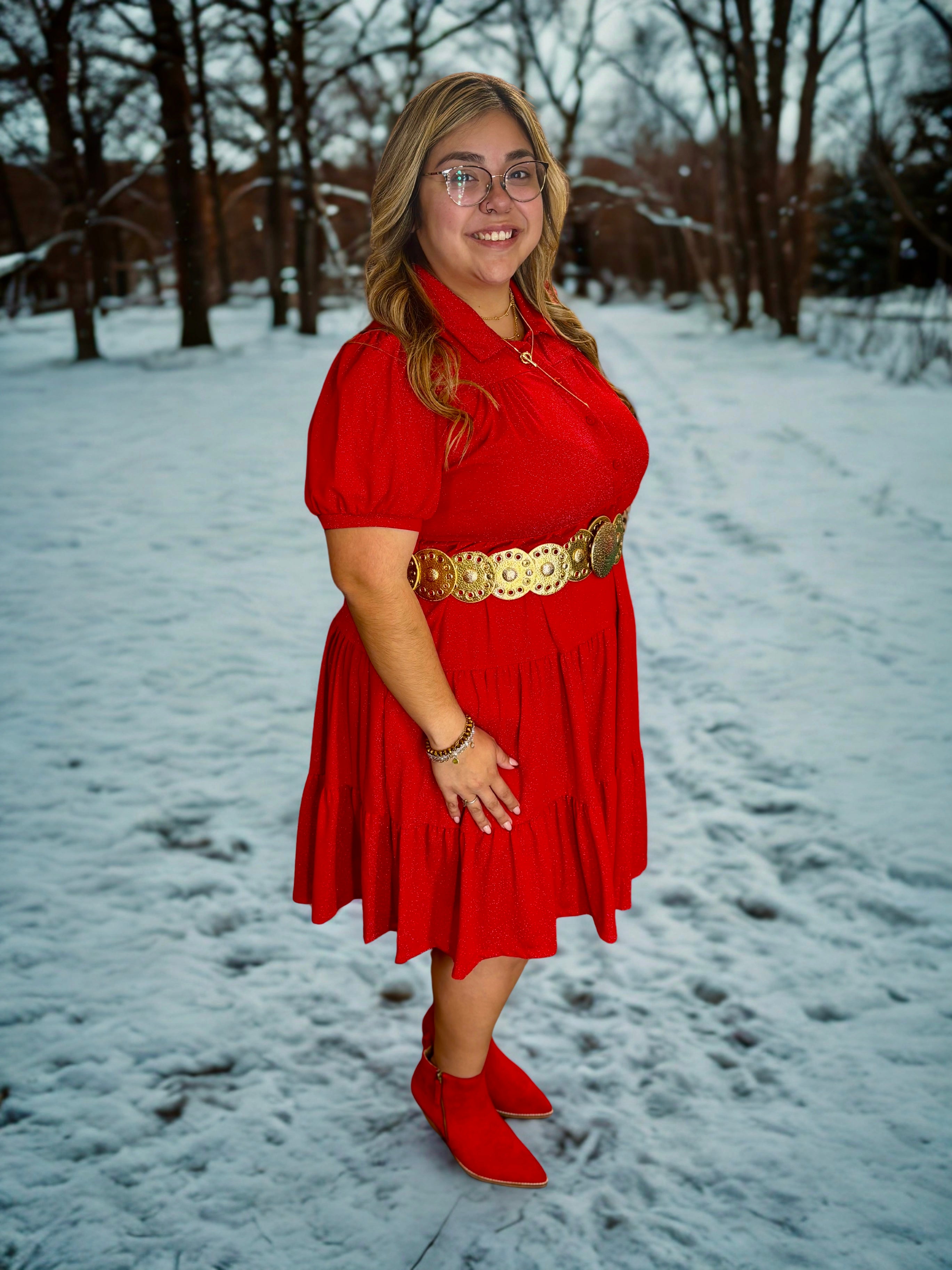 - Shine bright and stand out in the Red Sparkle Dress! This stunning short-sleeved piece features a light, comfortable fabric that glimmers beautifully with every move.