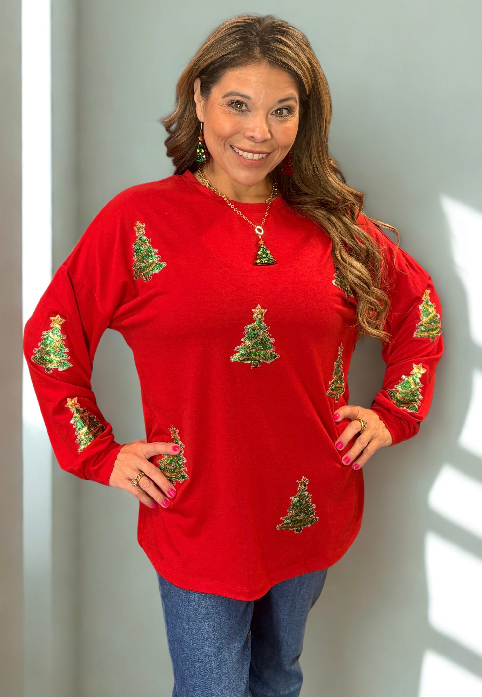 Celebrate the season in cozy, festive style with our Oh Christmas Tree Long Sleeve Tee! This holiday favorite features soft, premium cotton fabric for all-day comfort and a relaxed fit perfect for layering. The highlight? Charming Chanel-inspired tree patches delicately arranged around the shirt — adding a touch of sparkle, texture, and timeless holiday elegance.