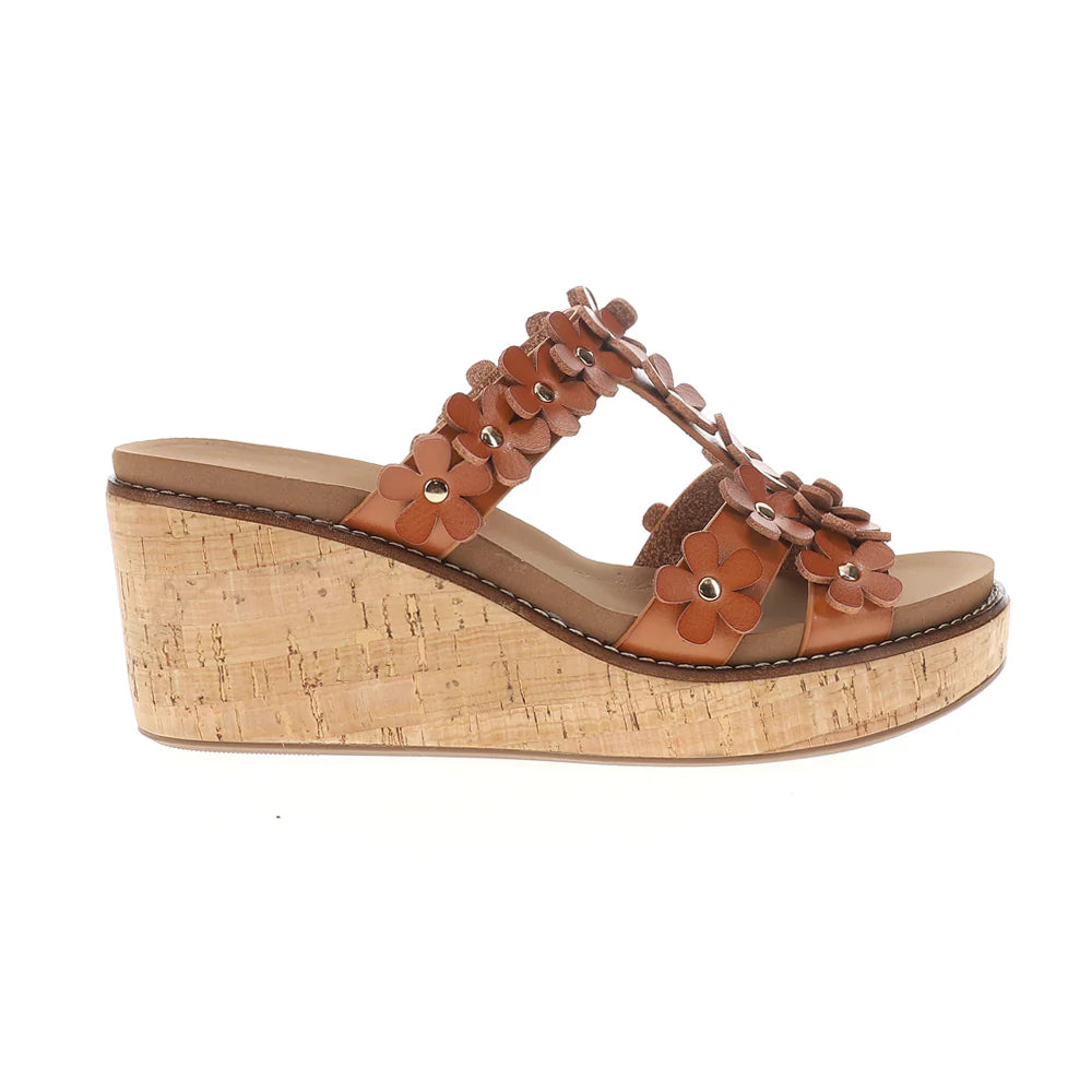 These charming wedge sandals feature a cork textured platform complemented by floral leather embellishments with metallic accents. The slip on design offers effortless style, while the cushioned footbed ensures comfort for all day wear. Perfect for adding a playful yet elegant touch to your summer wardrobe.
