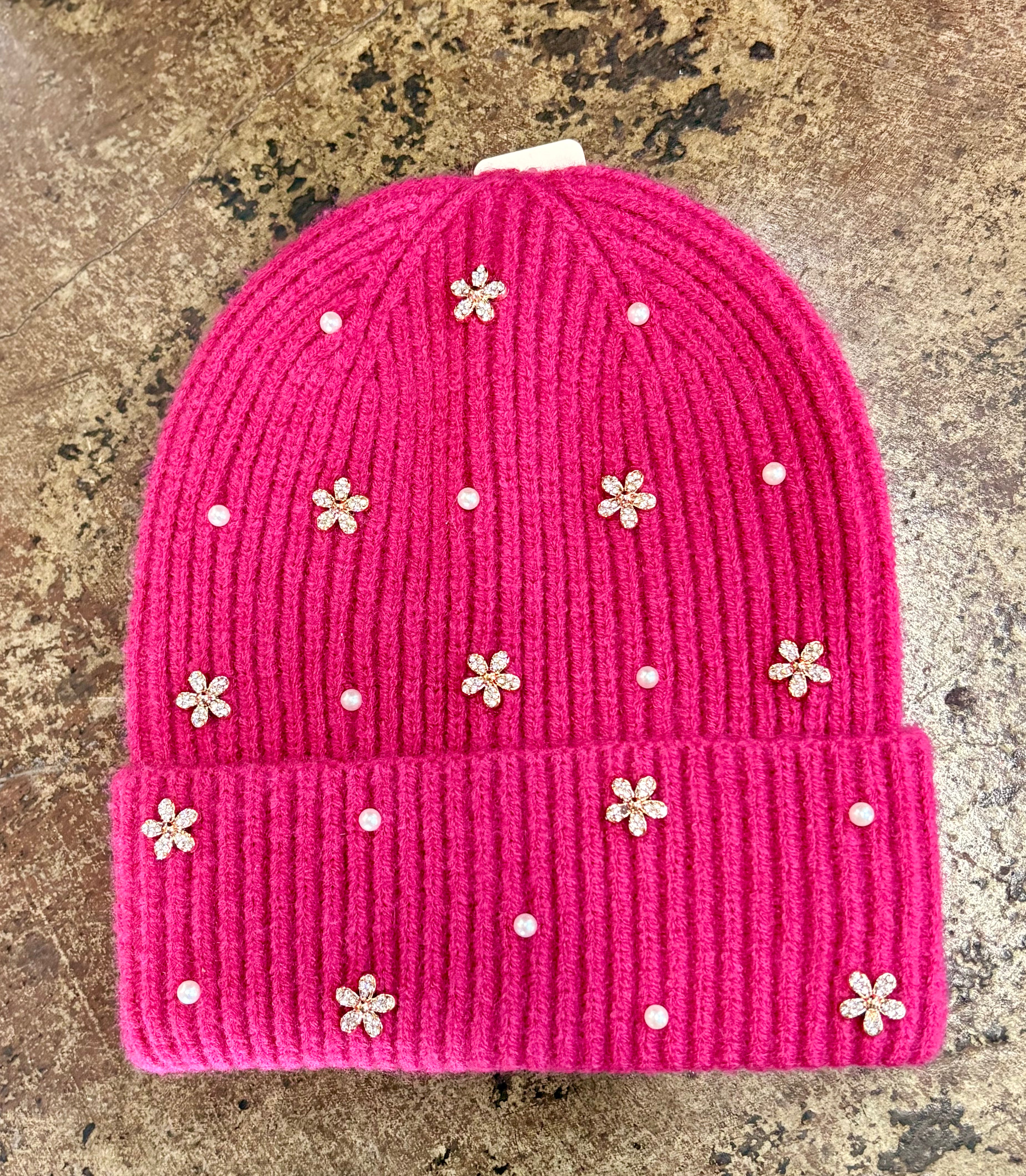 Add a touch of whimsy with the Blossom Glow Beanie! Soft pink and adorned with delicate flower gems and shimmering pearls, this cozy beanie brings charm and elegance to any cold-weather outfit. Perfect for staying warm while showing off your playful, feminine style.