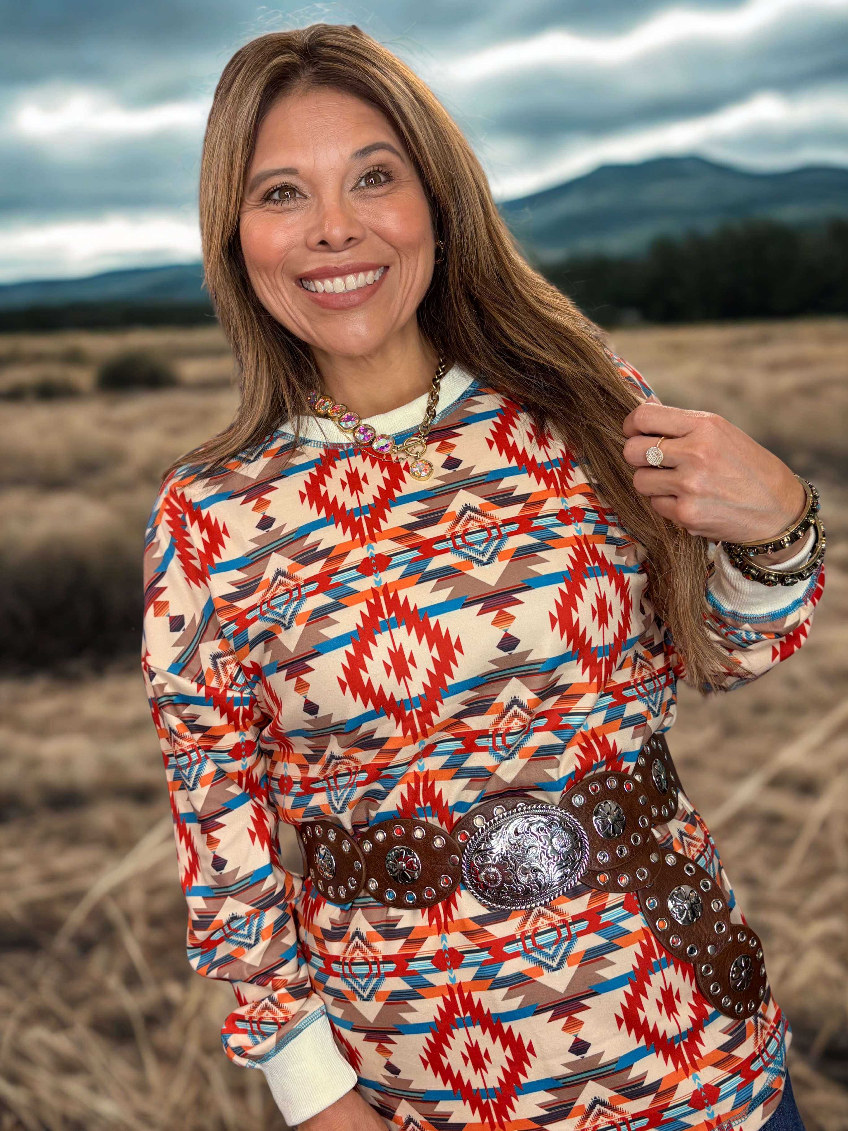 Adventure meets cozy in the Canyon Trail Sweatshirt! Featuring a bold Aztec-inspired design and soft, comfortable fabric, this sweatshirt captures that perfect blend of Western charm and everyday comfort.