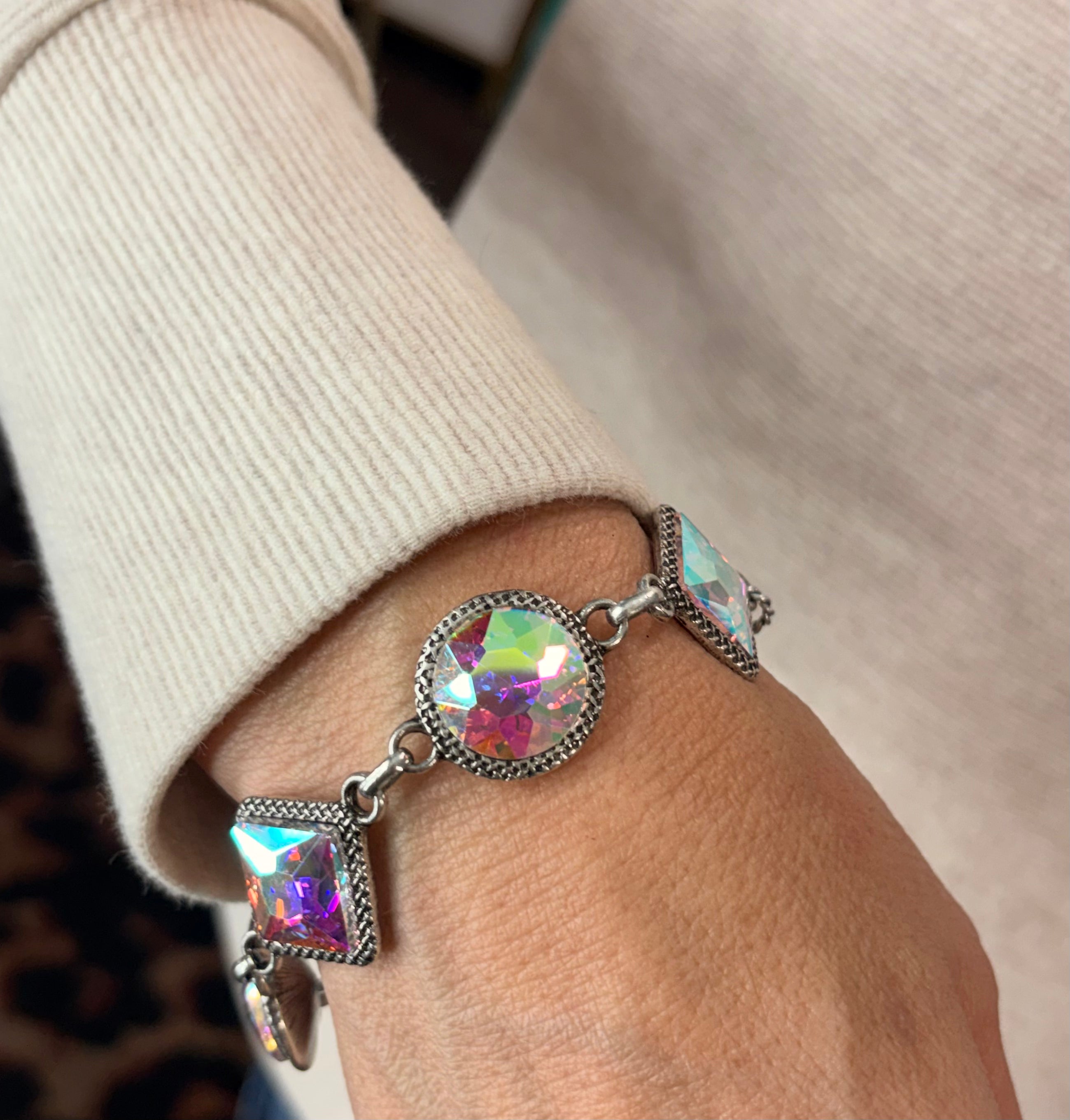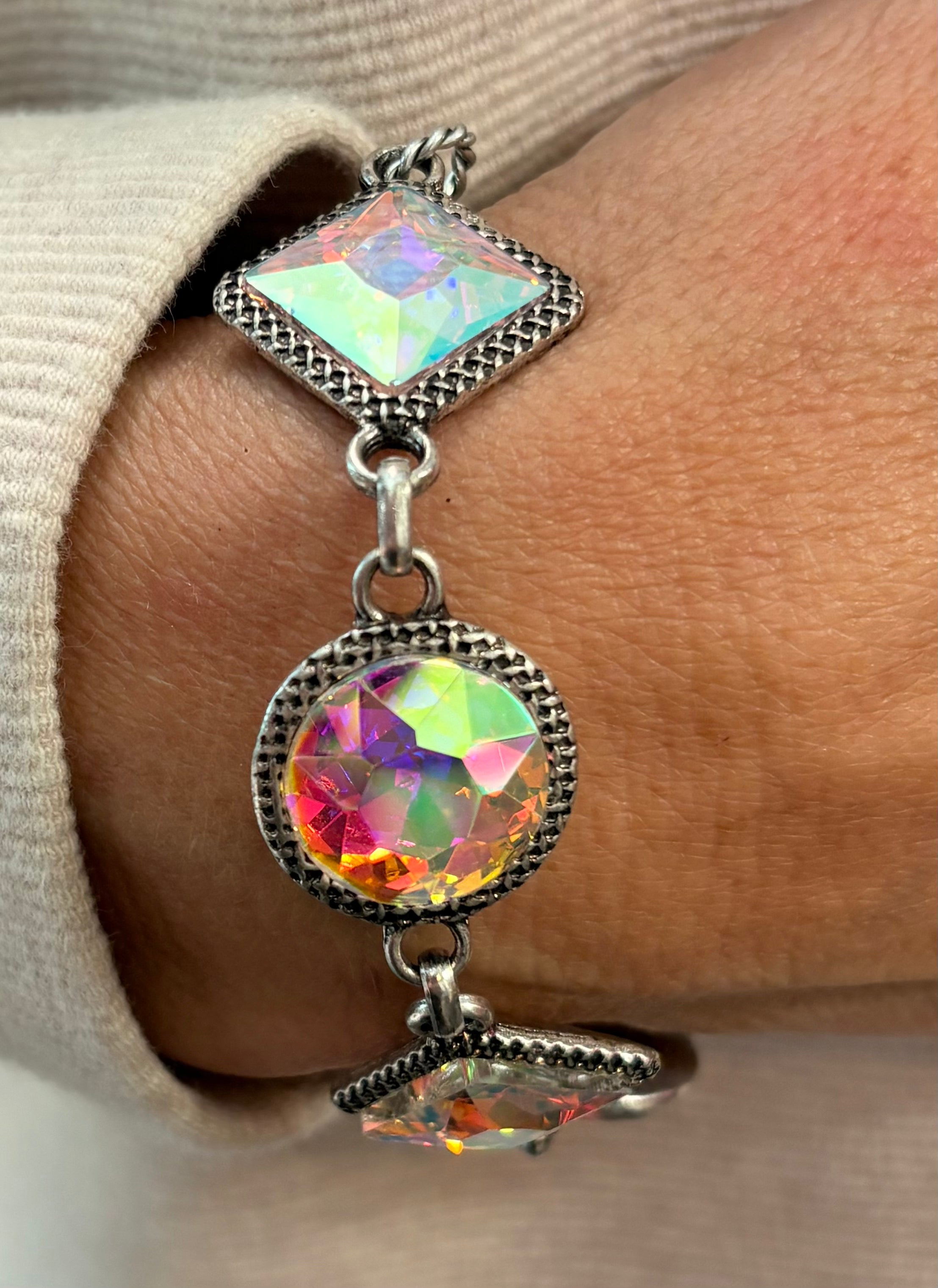 - Inspired by starlit skies and modern elegance, the Celestial Link Bracelet captures light from every angle. Crafted in a sleek silver-tone finish, this geometric cable chain design features subtle iridescent accents that shimmer with a soft rainbow glow. The lobster clasp closure and functional extender links make it easy to adjust for your perfect fit.