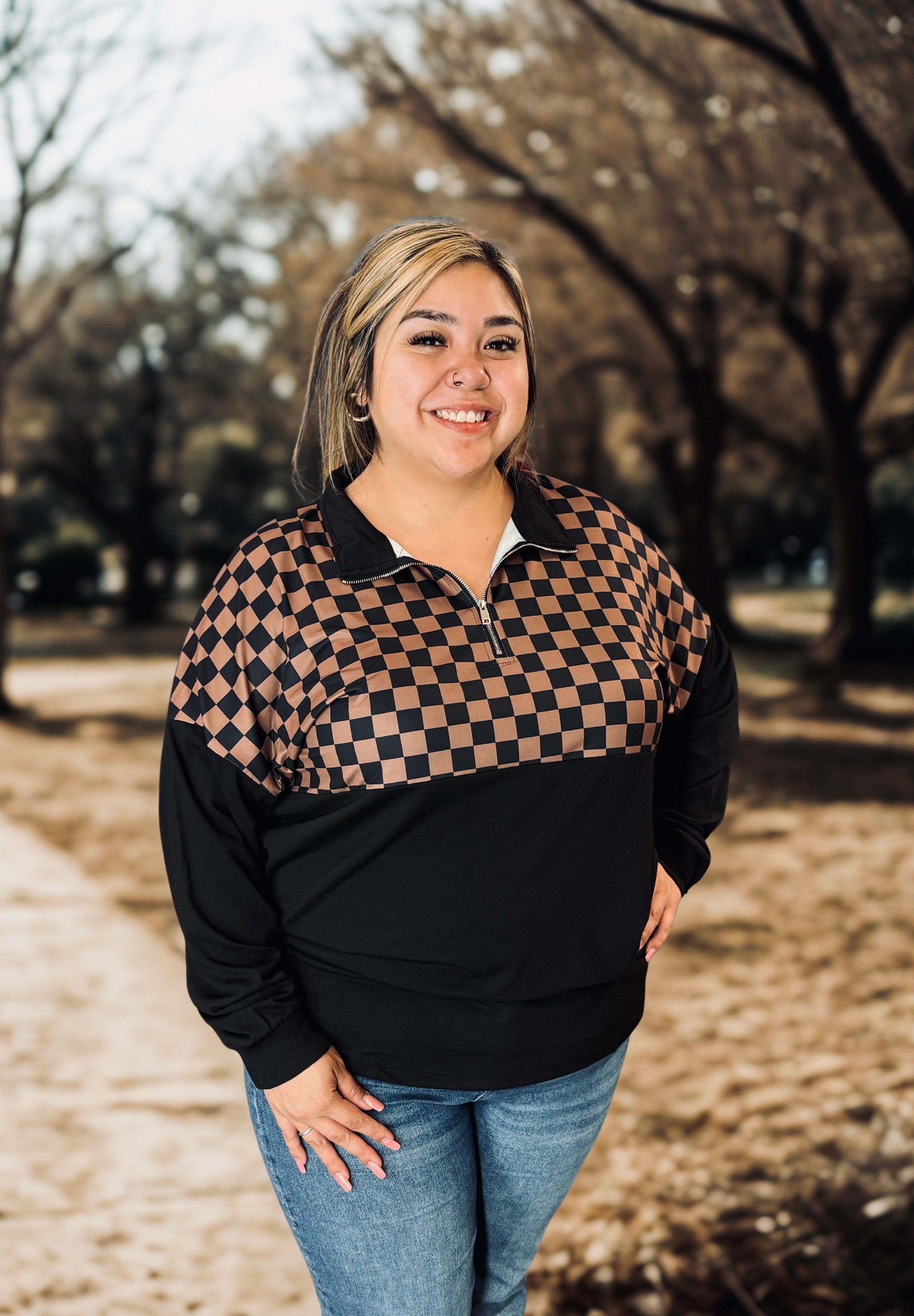 Get ready to check out in style! This cozy-chic pullover is serving all the right vibes with its bold brown and black checkered pattern — the perfect mix of trendy and timeless. The half-zip design gives you that laid-back, cool-girl look, while the soft, lightweight fabric keeps things comfy for all-day wear.