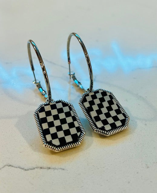 •  These trendy hoops feature a bold checkered print in your choice of pink & white or classic black & white, all outlined with a sleek silver trim for that extra pop.