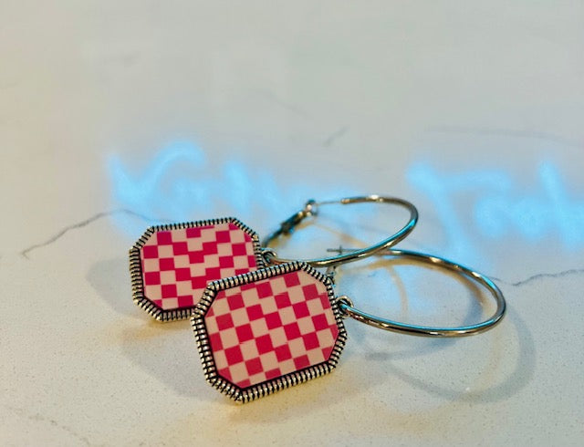 - These trendy hoops feature a bold checkered print in your choice of pink & white or classic black & white, all outlined with a sleek silver trim for that extra pop.