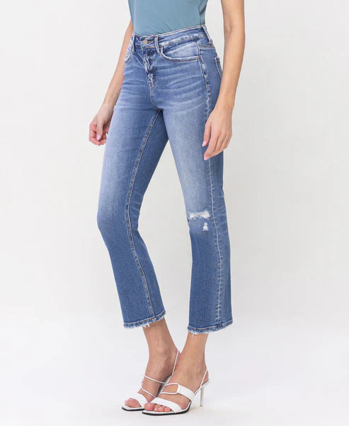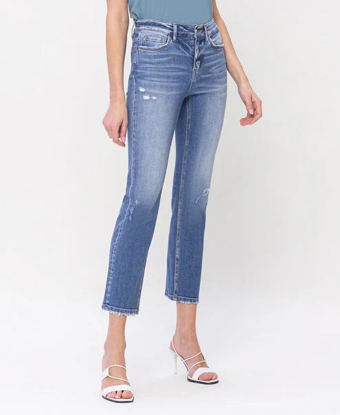 Comfort stretch denim, high rise waist, distressed detail, cropped length, slim straight jeans