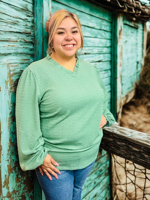 • This super cute long sleeve features a trend with shades of sage giving it a fresh, modern vibe that’s perfect for any season.