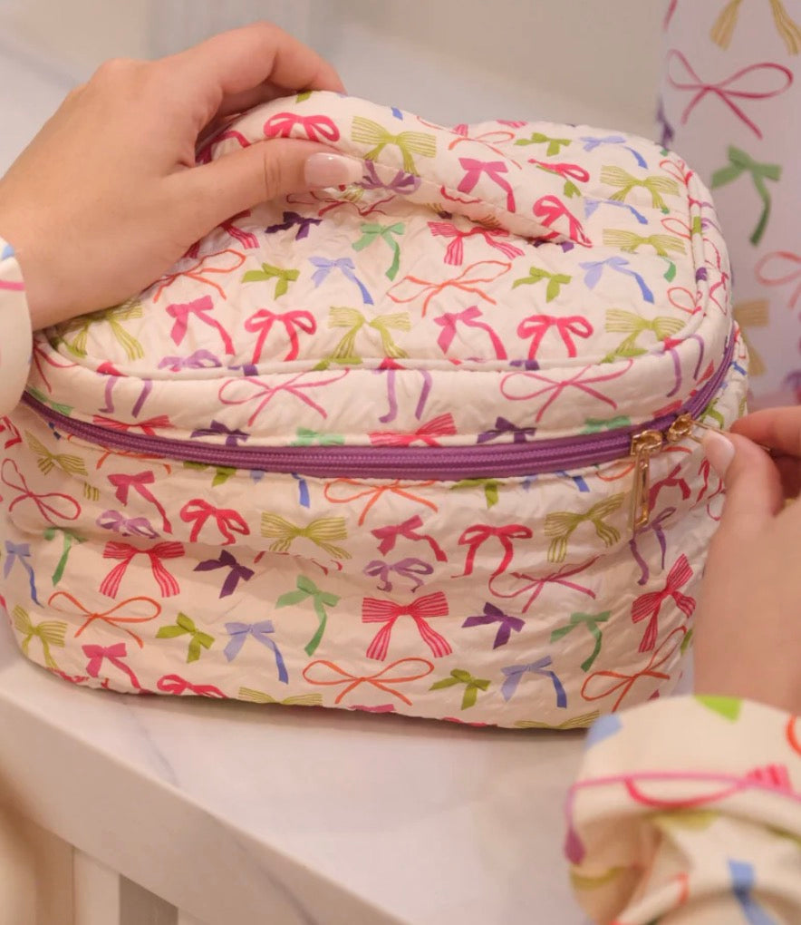 Quilted Bag, your travel ready essential for staying organized on the go. Designed with a structured silhouette, it features a quilted body for added durability and softness, a secure zip-around closure to keep contents in place, and a top handle for easy carrying. Spacious enough to hold beauty essentials, toiletries, or small accessories, this versatile bag is perfect for both everyday use and getaways.