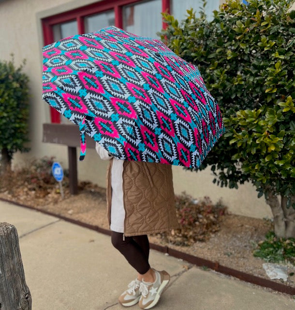 • Stay dry in style with the Montezuma Umbrella! This black umbrella features a unique pink, turquoise, and white Aztec pattern that will make you stand out from the crowd. Perfect for rainy days or adding a pop of color to any outfit. Don't let bad weather rain on your parade (pun intended)! Button to pop open and a velcro closure