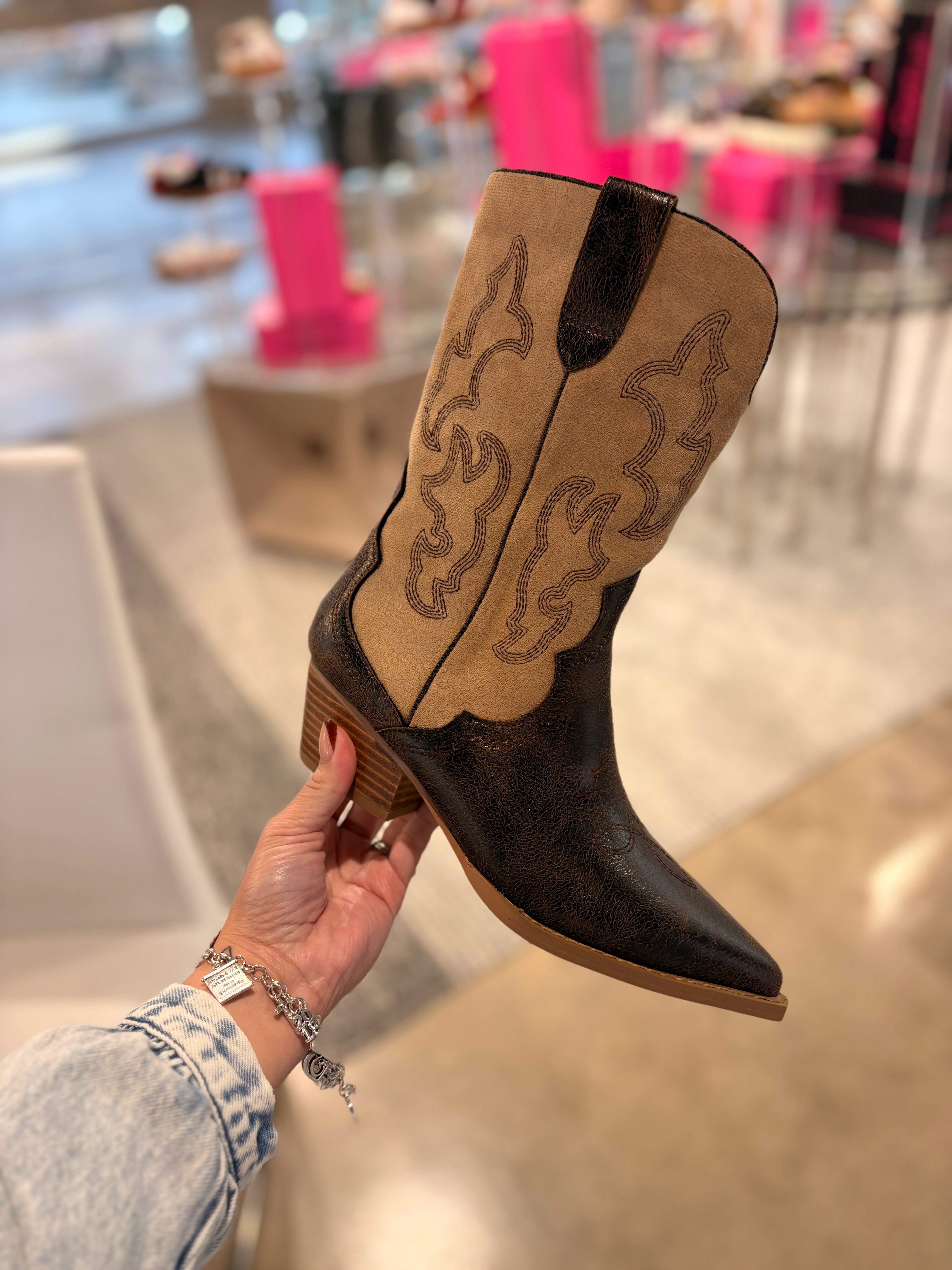 - Saddle up in style with the Kickin’ Up Dust Cowboy Boots—where rugged meets chic. With two-tone faux leather, detailed stitching, and a classic pointed toe, these boots are made for walkin', dancin', and turnin’ heads. Whether you're headed to a fall festival, a country concert, or just want to spice up your everyday look, these boots bring all the western vibes with none of the discomfort.