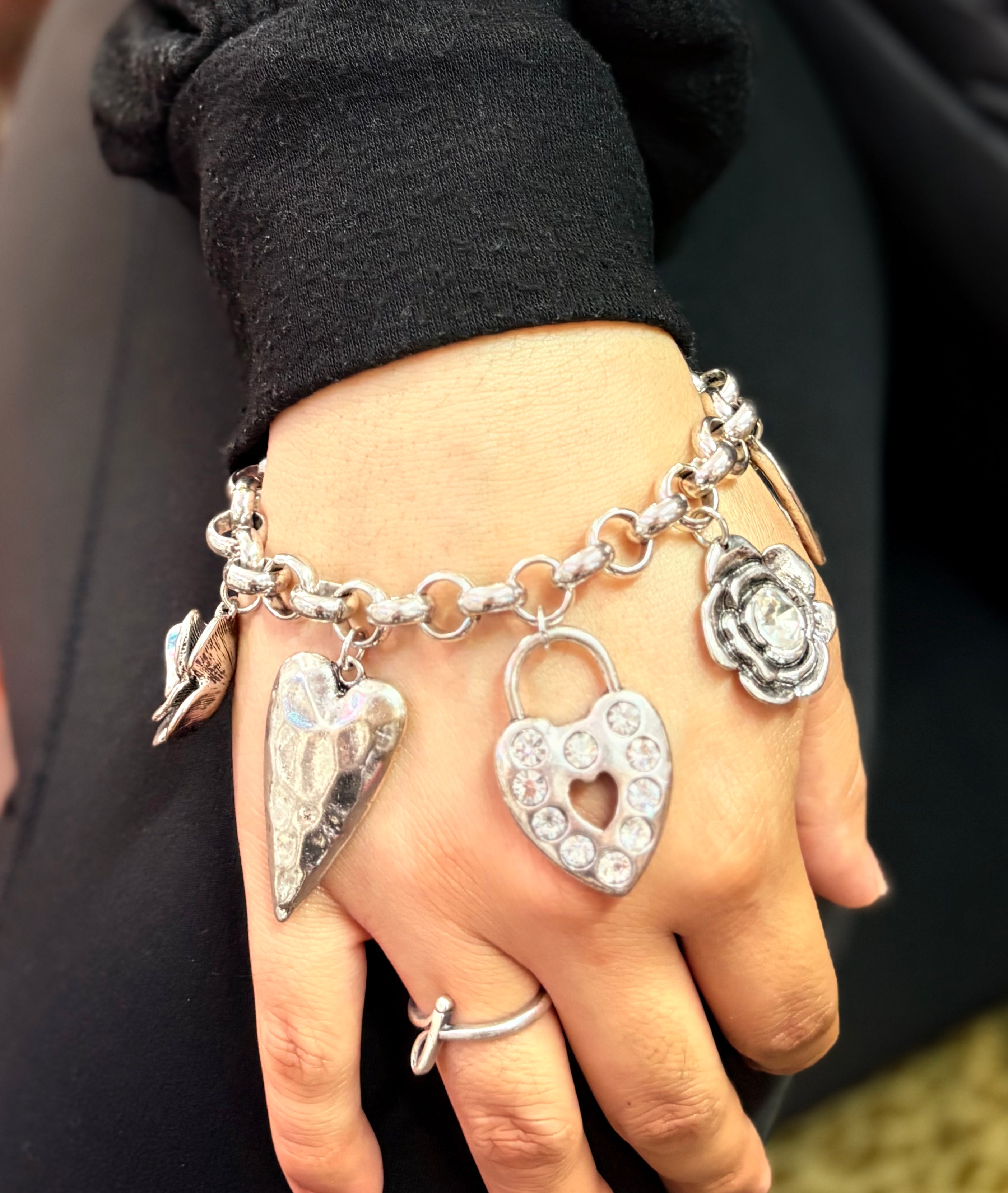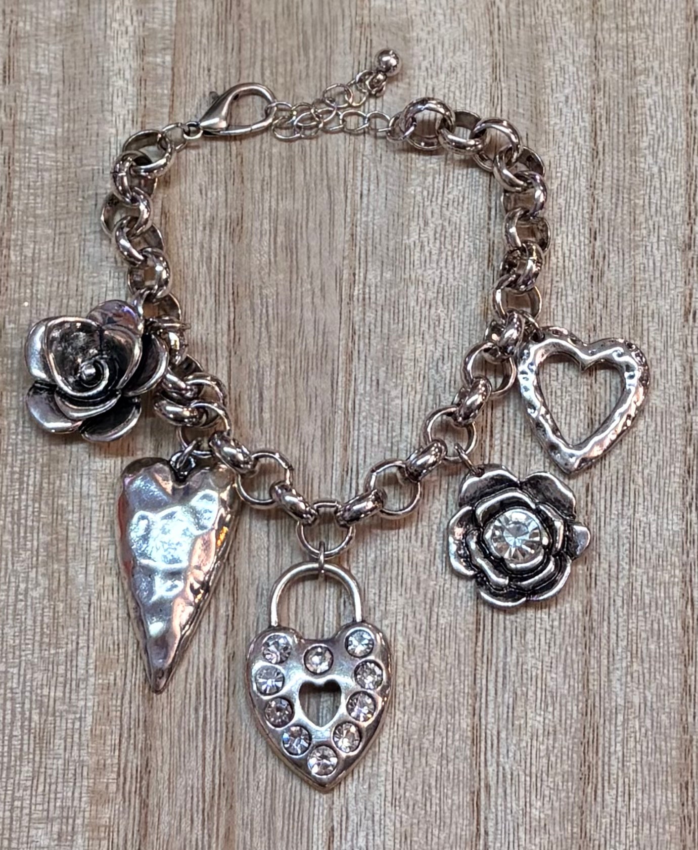 • Celebrate love, joy, and elegance with the Silver Bliss Charm Bracelet. This chunky silver-plated stretch bracelet features a delightful mix of charms — a solid heart, an open heart, a lock heart, a flower, and a sparkling flower with a clear crystal rhinestone center — creating a playful yet sophisticated design.