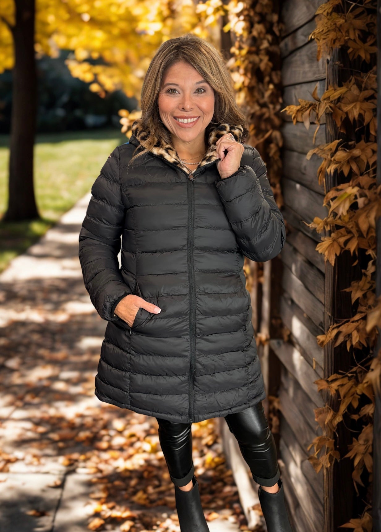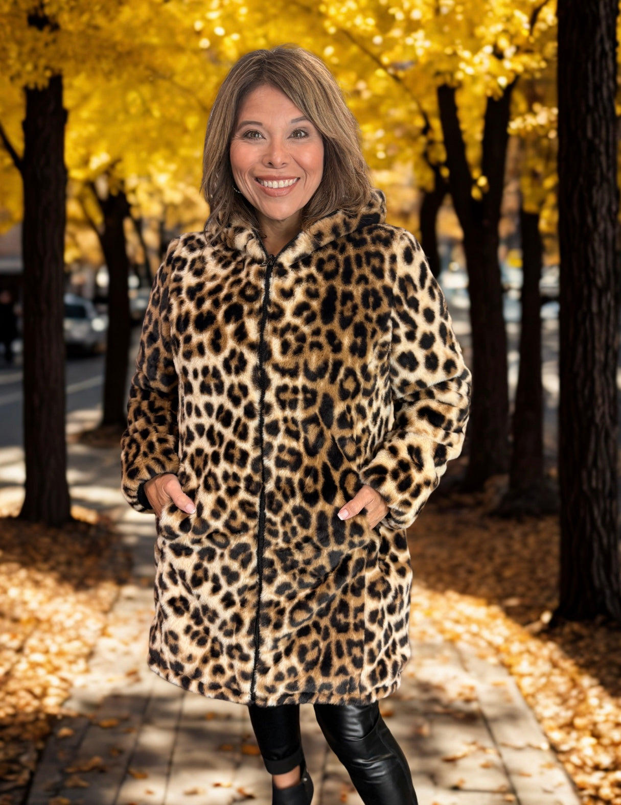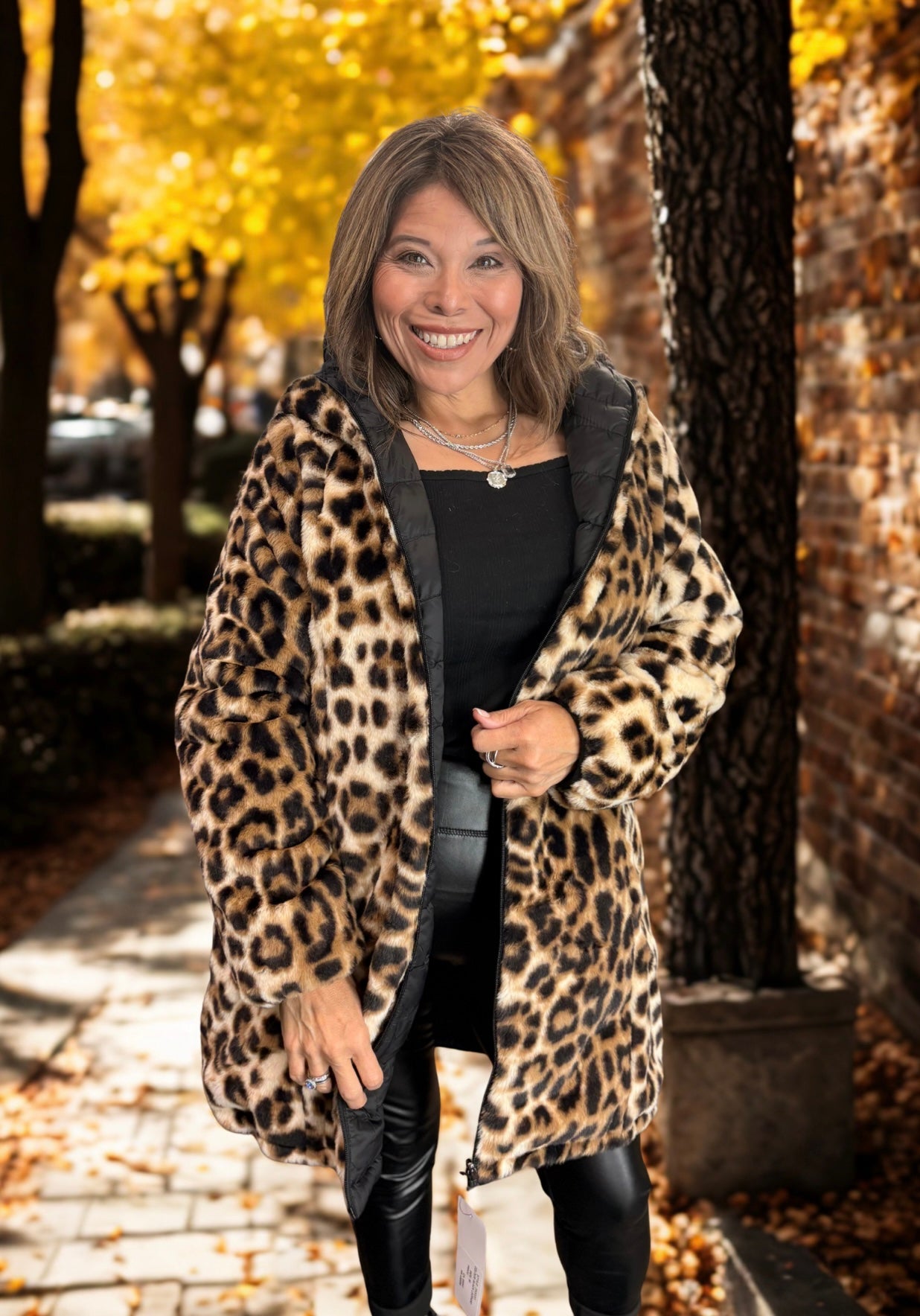 • Cozy, Chic, and totally versatile, this jacket features a bold leopard print and a sleek solid black on the other side.