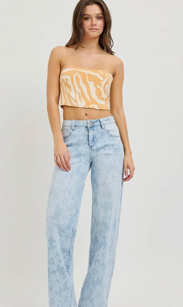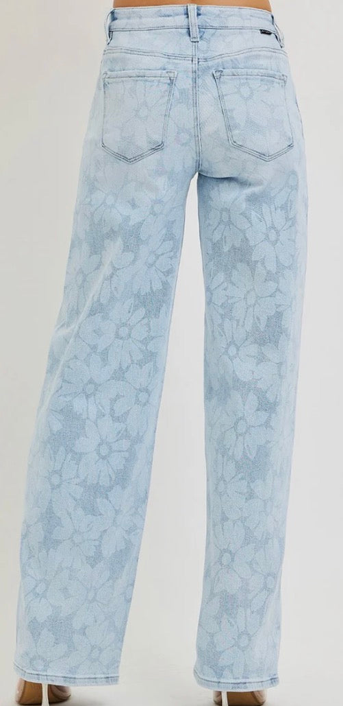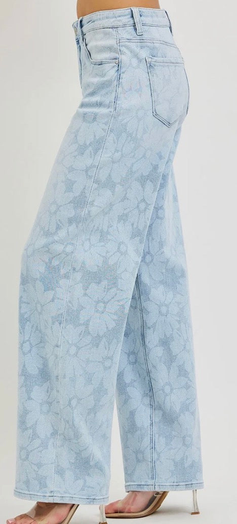 - Make a statement in the Wildflower Wide-Leg Jeans—a fun twist on a classic denim look. Designed with a flattering high rise and relaxed, baggy wide-leg fit, these jeans feature a charming floral print that adds a soft, feminine touch. Comfortable and eye-catching, they pair perfectly with everything from basic tees to dressy blouses.